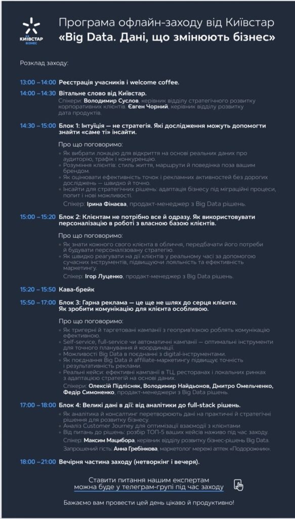 Big Data. Дані, що змінюють бізнес від Київстар – це не просто подія, це потужний інтелектуальний апгрейд для тих, хто живе бізнесом і хоче рухатись уперед. Говорили про: