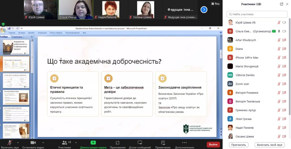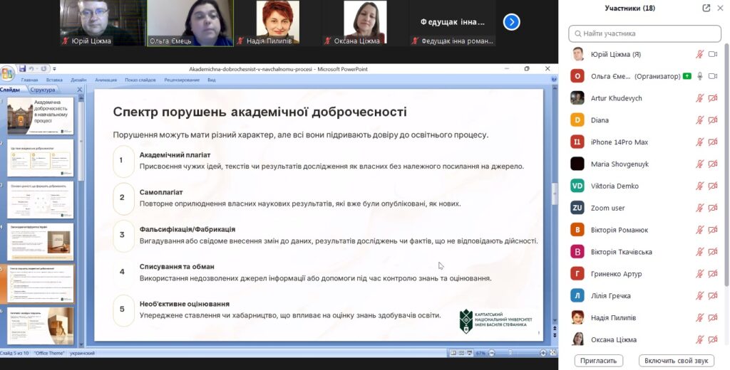 У Карпатському національному університеті імені Василя Стефаника для бакалаврів та магістрів кафедри підприємництва, торгівлі та прикладної економіки 23 жовтня 2025 року відбувся захід, присвячений важливій темі – академічній доброчесності у навчальному процесі.